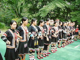 帰り道を次のポイントのアイニー族山塞で下車。吊り橋を渡り対岸の山にあがりアイニー族の集会場に行くとここでも沢山の観光客が押し寄せていた。見ているとこの種族の昔からの男女の見合いと婚姻風景を再現しているようである。広場では片方に20人くらいのここの若い女の子が民族衣装で飾り立てて並びその向かいには観光客のおじさんや若者がそれぞれ大きいハンカチ状の薄い布をもって並び笛や太鼓に合わせて歌を歌い合いっていたが、突然男たちが歓声を上げて女の子列に走りより好みの女の子の顔に手に持っていた布を被せ抱き寄せていた。そうして和気藹々と踊るのである。男たちは本当にうれしそうな顔をして幸福そうであった。この時ばかりはビデオカメラを持参しなかったこと後悔したものである。