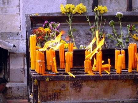 | 本堂内には多くの信者がくろいでいる | 境内内から見た本堂 |