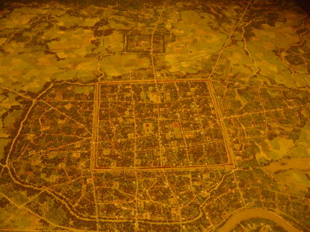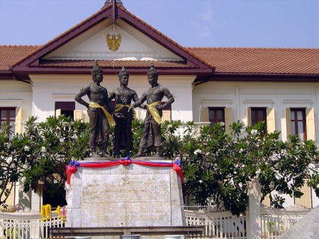 | 3人の王様の銅像。背後の建物はチェンマイ市立カルチャーセンター | 王国時代のチェンマイ市街地の模型 |