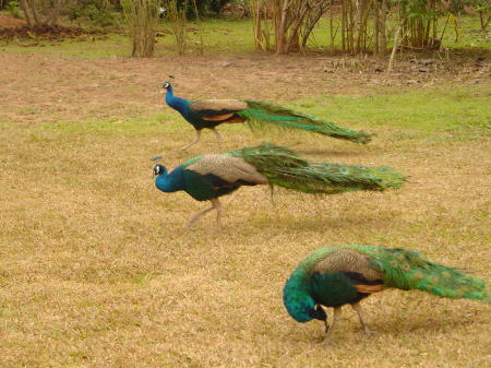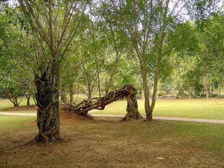 | 椰子の木を食い尽くした印度ガジュマル | 庭園内を遊ぶ孔雀 |