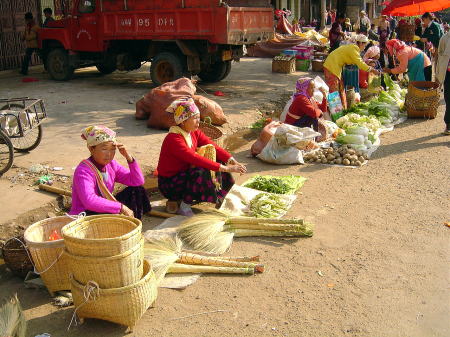 | ここでは孟混(Menghun)とガンランバ、2カ所の市場を紹介する。少数民族の女性を見る事は出来たが、珊瑚礁の中を泳ぐ魚のような若い女性に遭遇する事は出来なかった。 もっと大きい市場が景洪市内にあるが、美しいと言えるものではなかった。 |