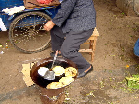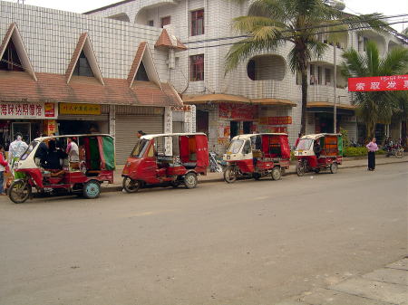 | お好み焼き? 1枚1元 | 市場の前には中国のティクティクが並んでいた。 |