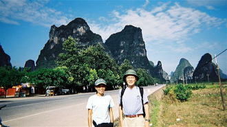 陽朔(左) 中国の20元紙幣の裏絵のモデルになった場所での記念写真です。 陽朔(右) 少数民族のオバサンのガイドで陽朔をサイクリング観光しました。 ニョキニョキ小山を縫うように幹線道路が走っております。 |