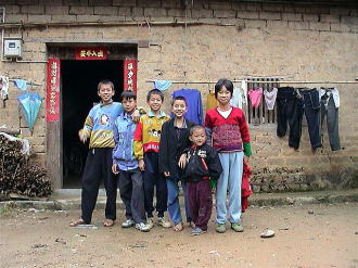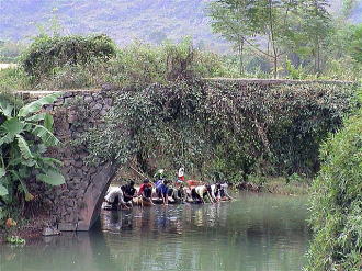 | 陽朔(左) サイクリングは村道を縫って進みました。小川で村の青年男女がにぎやかに野菜などを洗っていました。 陽朔(右) 興坪を散策中,部落の子供に誘われ,民家で昼食を食べました。 準備の間に遊んだ子供達です。 右端の子がこの家の子です。利発な子でした。 |