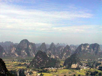 | 桂林(左) 漓江下り観光の日はすばらしい晴天でしたので,NHKが放映した天下の景観を堪能することができました。 陽朔(右) 月亮山山頂から見た周辺の景観です。ニョキニョキ小山の裾野に住居が点在しているのが良くわかります。 |