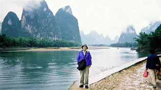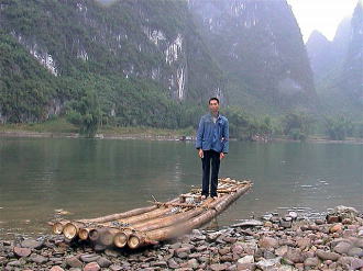 食事した家の主人の漕ぐイカダで川を下りました。少しガスがかかった漓江の景観を独り占め。 山水画の世界にドップリと漬かりました。 |