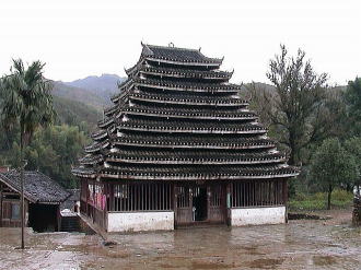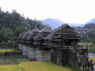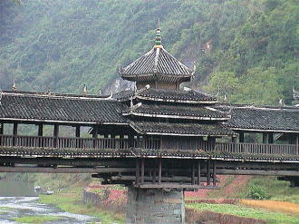 | 三江(左) 竜勝の梯田と三江の程陽風雨橋を見にでかけましたが,竜勝の梯田はものすごく濃いガスで何にも見えませんでしたので早々に退散し三江へ。 日本の各地にも優れた木造建築物がありますが,程陽風雨橋はそれらに匹敵する美しい木造の橋でした。塔の造り,細工,ものすごく手がこんでいます。五つの塔のバランスが絶妙でした。 三江(右) 程陽風雨橋には五つの塔があります。一番大きくて豪華な真ん中の塔です。 |
