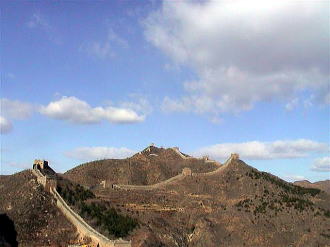 | 司馬台長城 (左) 今回の旅行の目的の一つが,チベットでランクルを借り上げて観光した仲間の「カスミ」と「テンテン」に会うことでした。司馬台長城を観光したいと言ったら後輩を誘ってマイクロバスをチャーターしてくれました。 (右) 司馬台長城には左と右に嶺があります。右手の嶺が一般コースです。登っていきますと眼下に左手の雄大な長城が広がります。