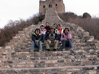| 司馬台長城 (左) 右手奥の一番険しくて人気のある場所(天梯)は,転落の恐れがあり立ち入り禁止でした。公安が駐在し見張っていました。 (右)司馬台長城を一緒に観光したシンガポールからの留学生「テンテン」と後輩達です。「テンテン」は4年生,左手前から奥へ3人目です。