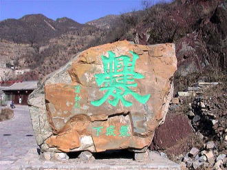 | 川底村 (左) 北京人に人気があるという明・清時代の古村・川底村を見に行きました。約70戸のこじんまりとした集落でした。部落全戸が民宿になっているような感じで,ほとんどの家に民宿の看板が下がっています。家の造りはこじんまりとした四合院造りでした。 (右) 川底村の川の字は略字だそうで,本来は26画もあるこんな漢字なんだそうです。さすが本場には,すごい漢字があるものですね。 |
