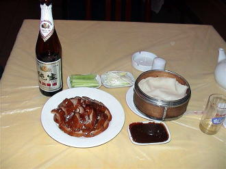 | 北京ダック 上海蟹で始まったので北京ダックで締めます。薪を焚いている釜でコンガリと焼いた北京ダックを食しました。パリパリの皮と肉の食感が絶妙でした。ビールと合わせて58元。約900円でした。 |