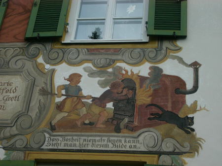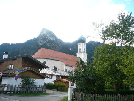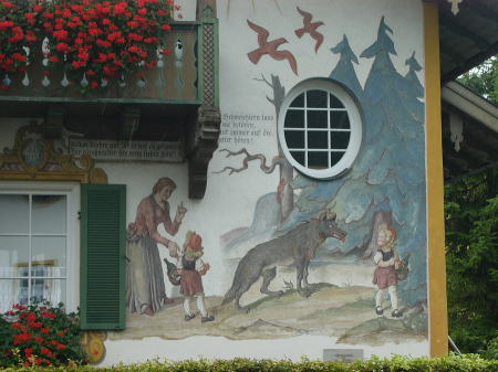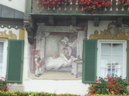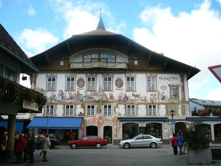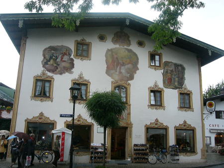 | ムルナウから出ている支線で40分、ここはフレスコ画で美しく飾られた家々が多く、街全体が屋外美術館のようだ。又、バスで25分ほどに、ルートウ”ィッヒ2世の建てたリンダーホフ城がある。 オーバーアマガウは10年に一度、受難劇が上演される町としても有名で、町のショーウィンドーは、聖書を題材にした木彫りの装飾品も多く、眺めるだけでも楽しい。 |