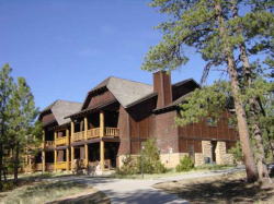 ブライスキャニオン国立公園 ブライスキャニオンロッジ(左の写真)は予約制でかつ前払いです。 右はブライスポイントから全景を撮ったものですが、背後の山が山火事で白い煙がもくもくと立っていました。 |