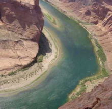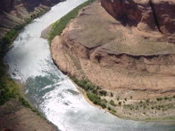 | 馬蹄形をしたコロラド川 (グレンキャニオン) グランドキャニオンの上流部がマーブルキャニオン、リーズフェリーを経て、グレンキャニオンに入ります。その上流部はパウエル湖になります。 Muleshoe Bend(馬蹄の曲り)を崖の上から見に行きましたが、大きすぎて1枚の写真に入れる事が出来ませんでした。 |