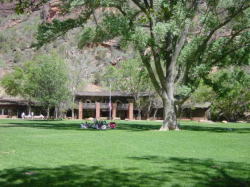 | ザイオン国立公園 ザイオンロッジは要予約、かつ前金制です。ロッジの前に展開する芝生のある広場で木陰の下でくつろぐ姿を見ると、それだけでここに来た価値がありと、思いました。 右の写真が示すようにザイオンの特徴は大きな1枚岩で出来た山と言う事が出来ます。 |