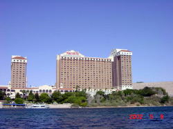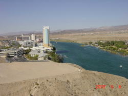 | ラフリン 初日の宿泊地はラフリンでした. 左側の建物は泊まったホテルです。宿泊費は税込みでなんと1室27.25ドル。右側は部屋からの眺めです。市街地の脇をコロラド川が流れています。 |