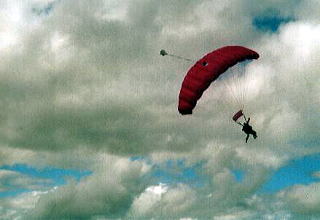 | ついにスカイダイビングをやった。インストラクターが跳んだから一心同体の私も仕方なく一緒に落ちた。初めはくるくる旋回するのでどうしたものかと思ったが、パラシュートが開いたら、何のことはないパラグライディングと同じだ。 高度12000フイート、落下時間45秒、NZ$199。 タウポ゚湖にて。 |