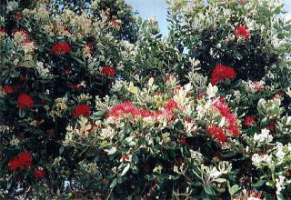 | Pohutukawa(ポフツカワ )。俗名クリスマスツリー。 もう花が終わっていたが、北島にはこの木がたくさんあってクリスマスの頃はすべての木々が真っ赤になるそうだ。 |