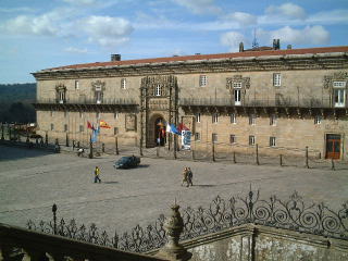 | 「サンチャゴのパラドール」 キリスト教徒にとって非常に大事な街「サンチャゴ・デ・コンポステッラ」の大聖堂の前の広場に面して建つパラドール。外観に似ず、内部は豪華!!の一言。この街に行ったら必ず泊まった方が良い、と書いてあるのを見て、インターネットで予約し、日本の代理店経由では3万円近くするツインの宿泊費が\20,000で済む。スペイン全体でも5つ星のパラドールはこことあと一箇所のみ。 |