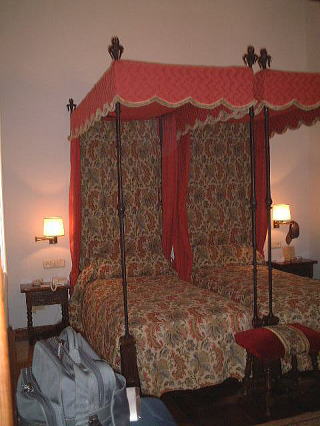 「天蓋付き ツインベッド」パラドールの部屋。若い女性達だったら歓声を上げそうな部屋で、調度品も一級品で埋められていたが、絨毯の下の板張りの床は歩くとギシギシと音がして、ウグイス張りの様。入り口のドアや物入れも重厚な木製作り。 |