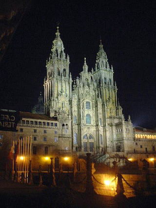 「夜の大聖堂」 異教徒である私にも、その荘厳さが伝わって来る。内部には勿論「聖ヤコブ(サンチャゴ)」の棺が収められていて、だれでも見る事が出来る。昼間、ここにTAXIで到着した時、辺りにガイタと言うバグパイプの音が響いていた。ここガリシアは、ケルトの血を引く人達の地方でもある。 |