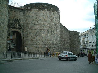 「LUGOのローマ時代の城壁」 LUGOの旧市街はこのローマ時代から有る城壁に囲まれていて、その全長約2Km。保存状態が良く、城壁の上は格好の散歩道。所々にこの様な門が有る。内部はしっとりと落ち着いた町並みが続き、この地方の中心であるこの街の雰囲気はVIGOと同様、上品!我々は、この城壁の直ぐ外側の道路に面したオスタルに飛び込みで一泊した。 |