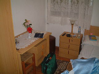 | 「一泊¥1440の部屋」 この部屋、小さいが必要にして十分。廊下を20歩位行った所にシャワーとトイレの専用の部屋が有る。この部屋に連続して30日泊まると\35,000。宿泊客は、道路に面した入り口のドアのカギ、オスタル部の入り口のカギ、部屋のカギの3つのカギを渡され、日本並に安全な街に更に安全・安心。 |