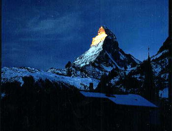 | そこからの眺望がすばらしい。 アルプスの名峰を背にする爽快感。 ヨーロッパ人は太陽を求め、自然と戯れる。 レストランのテラスで日向ぼっこをしながら、 食事をたのしむ。勿論、ビール・ワインも。 マッターホルン ⇒ |