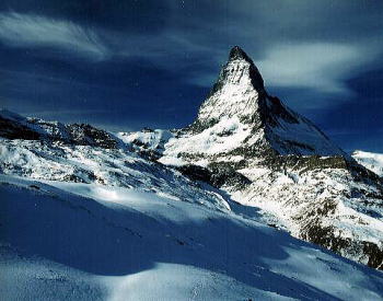 | スイスのスキーは楽しい。 天候が比較的安定で、好転に恵まれる機会が多い。 3千数百mまで機械化され、一般人が自由に訪れることが できる。 マッターホルン ⇒ |