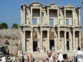 ケルスス図書館 エフェソス都市遺跡はアルミテス神殿を中心に発展し1世紀〜2世紀にかけて作られた野外劇場は収容人員2万5千人の大きなものでした。また華麗なケルスス図書館は見事なものです。 エジプトのアレキサンドリア図書館、ベルガマの図書館に次ぐもので 12万冊の蔵書があつたそうです。 |