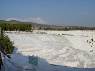 綿の城温泉(ヒエラポリス)パムッカレ温泉と呼ばれています。 此処は並外れた自然の驚異だと思います。地面から湧き出た石灰成分を多く含み摂氏35度の温泉水が高さ100mから山肌を流れ無数のプールを作っていました。心臓病、高血圧、リュウマチ、目や皮膚病、消化疾患、等の病気のある人は効果がありますよ! |