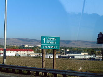 | 途中、ララミーという所を通りました。その昔テレビで見た「ララミー牧場」の舞台では・・・と、嬉しくなりました。やはり窓の外は牧場が広がり、牛の群れが遊んでいました。白く塩で縁取られた池などが点在しています。 | ![]() |